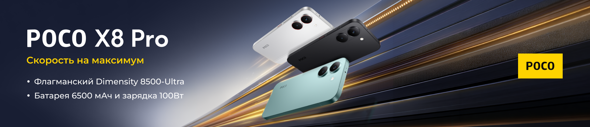 POCO X8 Pro — концентрация технологий в защищенном корпусе. За быстродействие отвечает процессор MediaTek Dimensity 8500 Ultra с графикой Mali-G720. 6.59-дюймовый AMOLED-экран с разрешением 2756x1268 и частотой 120 Гц обеспечивает идеальную четкость. Двойная основная камера 50 Мп + 8 Мп и фронтальный модуль на 20 Мп готовы к любым сценариям съемки. Аккумулятор 6500 мАч и 100 Вт быстрая зарядка HyperCharge гарантируют длительную автономность.